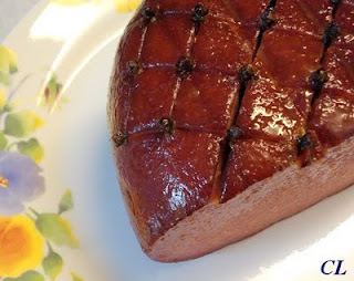 Forrar uma forma com papel alumínio. Colocar o presunto na forma. Fazer cortes no topo do presunto com a ajuda de de uma faca afiada de forma decorativa. Onde as linhas se encontram, espetar um cravo-da-índia. Reservar.